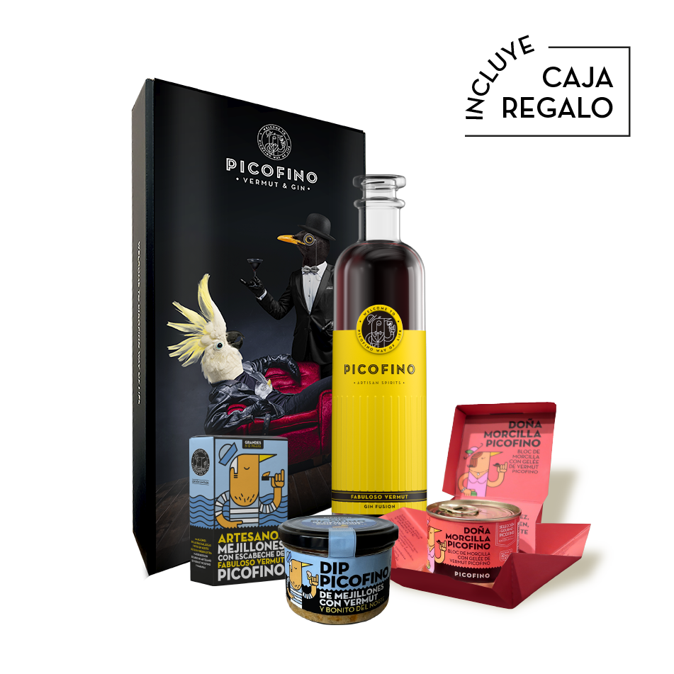 Selecciona 1 botella y 3 aperitivos para incluir en tu caja regalo Picofino. Caja regalo gratis.