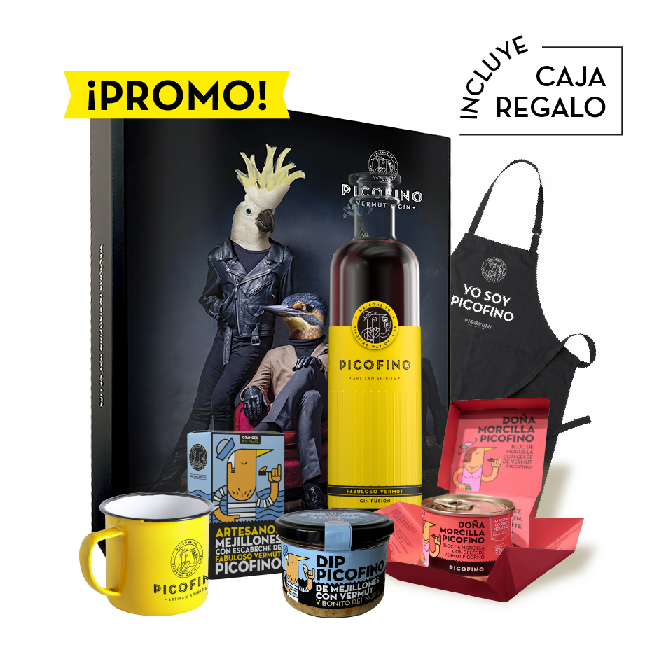 Selecciona 1 botella y 3 aperitivos que quieras incluir en tu caja regalo Picofino junto con el delantal y la taza. Caja regalo gratis.