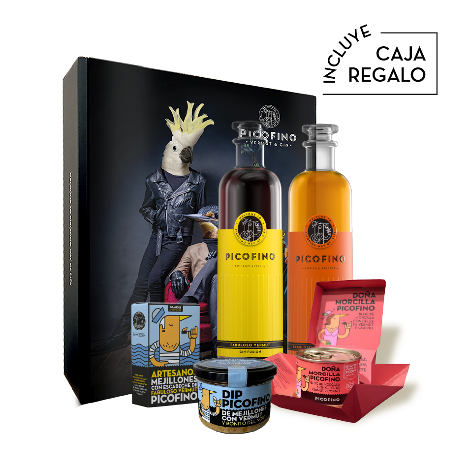 Selecciona 2 botellas y 3 aperitivos que quieras incluir en tu caja regalo Picofino. Caja regalo gratis.
