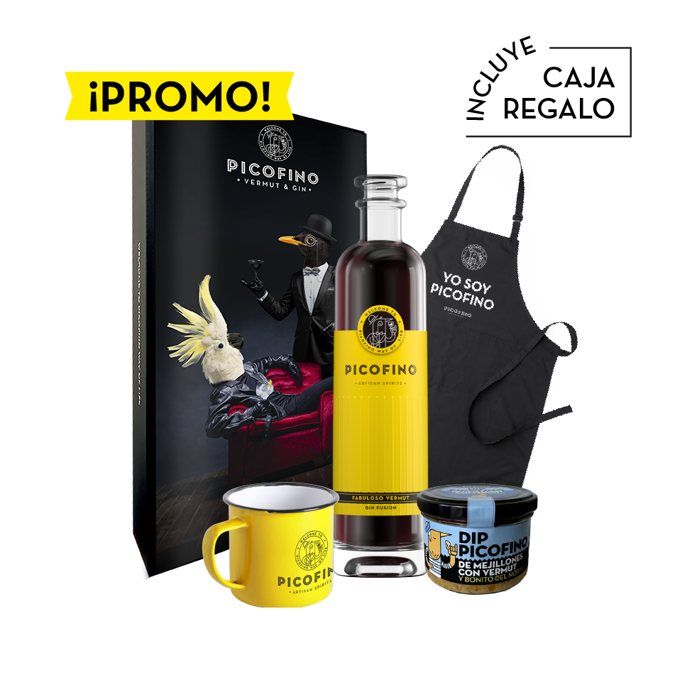 Selecciona la botella y el aperitivo que quieras para incluir en tu caja regalo Picofino junto con el delantal y la taza. Caja regalo gratis.